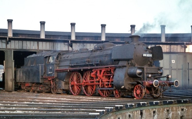 Bild oben: Die allerletzte Fahrt führte die 18 323 im September 1969 von Frankfurt nach Basel. Hier steht die Lok in BW Frankfurt Main. Copyright: Günter Hauthal / Slg. Eisenbahnstiftung